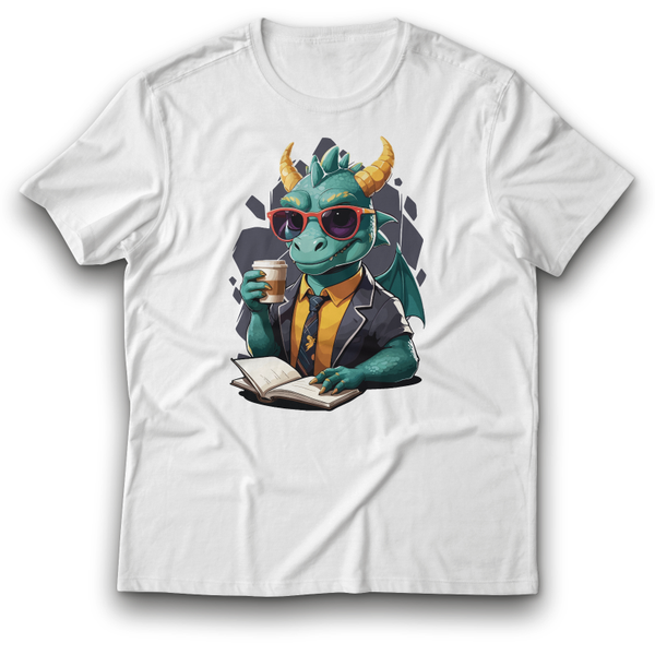 Leser Drache trinkt Coffee-to-go Kaffee Buch Brille Cool Fun Mischwesen Fabelwesen Fantasie T-Shirt weiß 122 - 3XL Baumwolle DTF
