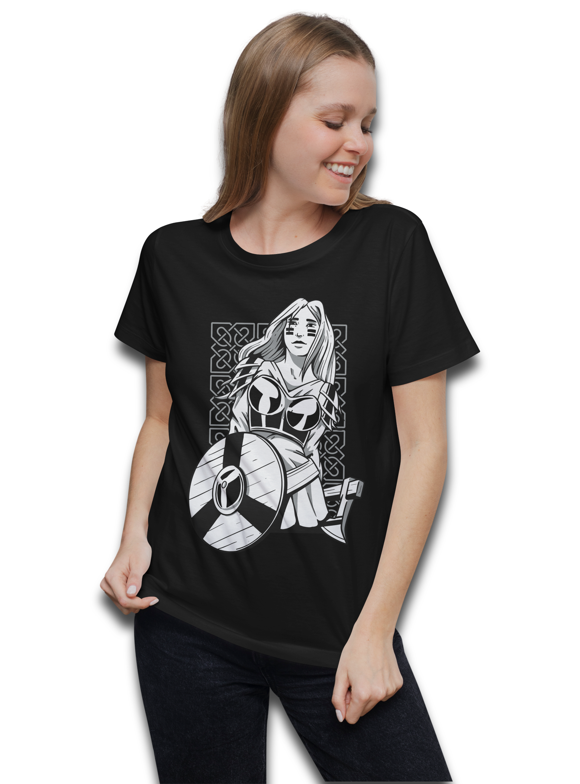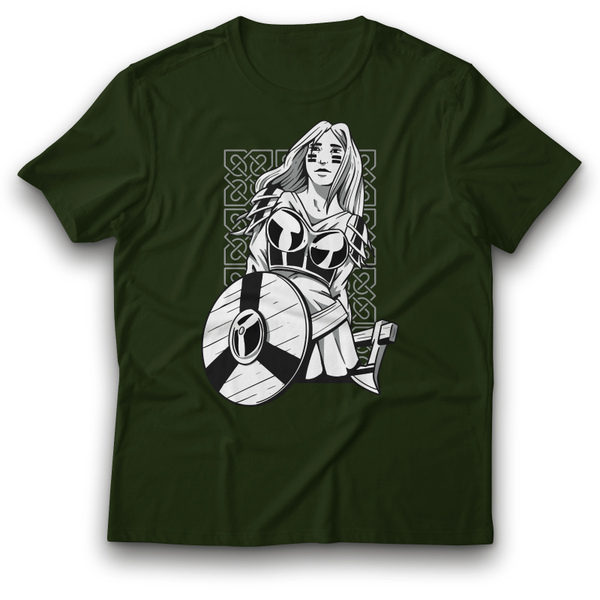 Wikinger Frau Mädchen mit Schild & Axt Schildmaid Kriegerfrauen T-Shirt 122 - 3XL Baumwolle
