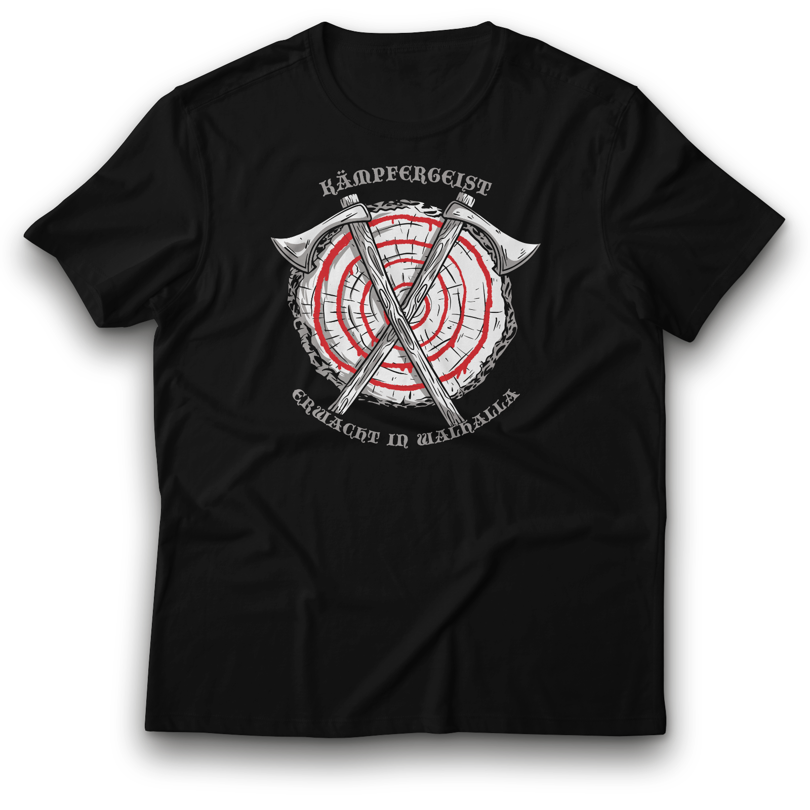 Spüre den authentischen Wikingergeist mit unserem kraftvollen T-Shirt „Kämpfergeist – Erwacht in Walhalla“. Das ausdrucksstarke Design zeigt zwei gekreuzte Äxte auf einer Zielscheibe aus Holz, symbolisch für Kraft, Präzision und Entschlossenheit. Die klaren, roten Akzente auf der Zielscheibe setzen dabei einen markanten Kontrast und unterstreichen das kämpferische Element der Wikinger-Kultur.