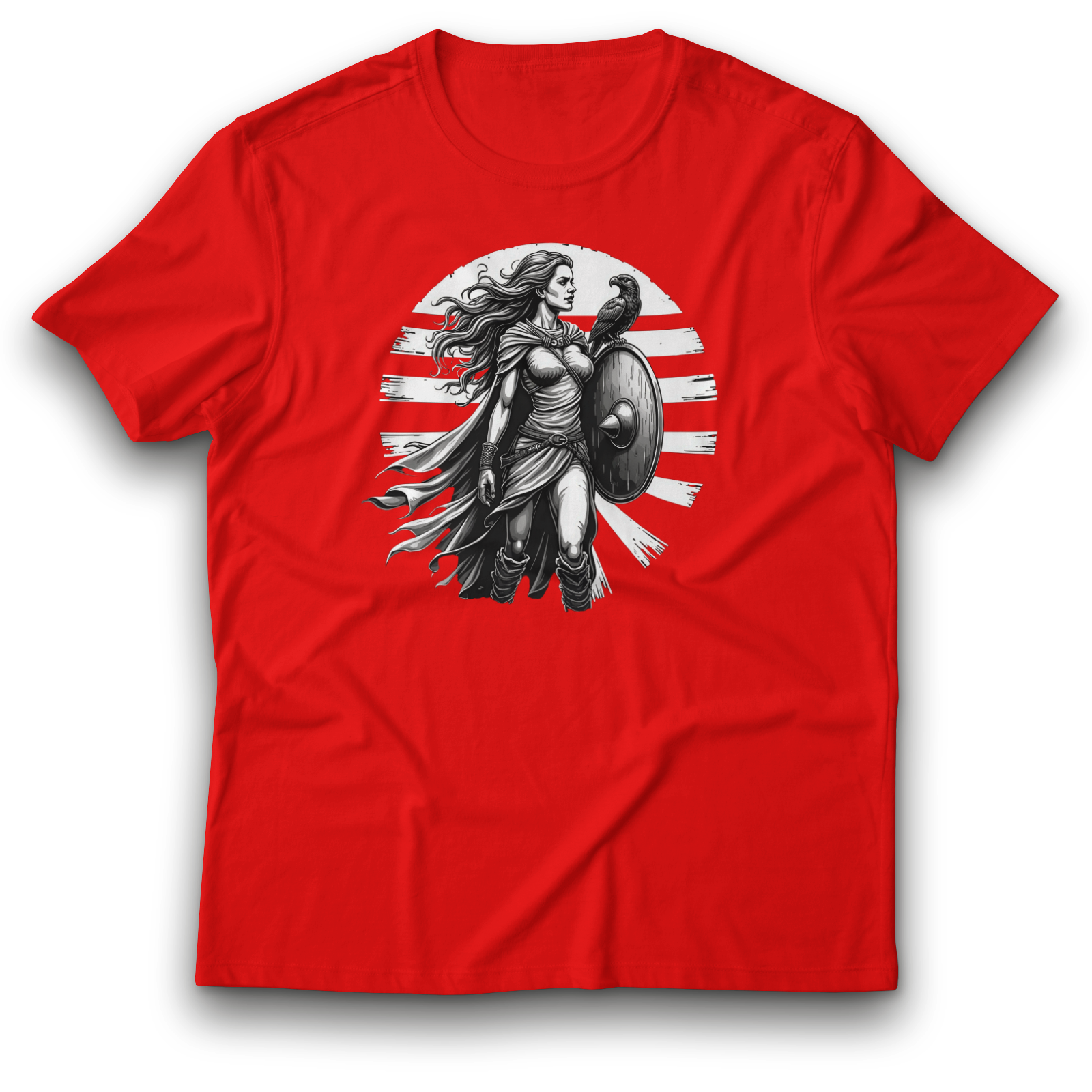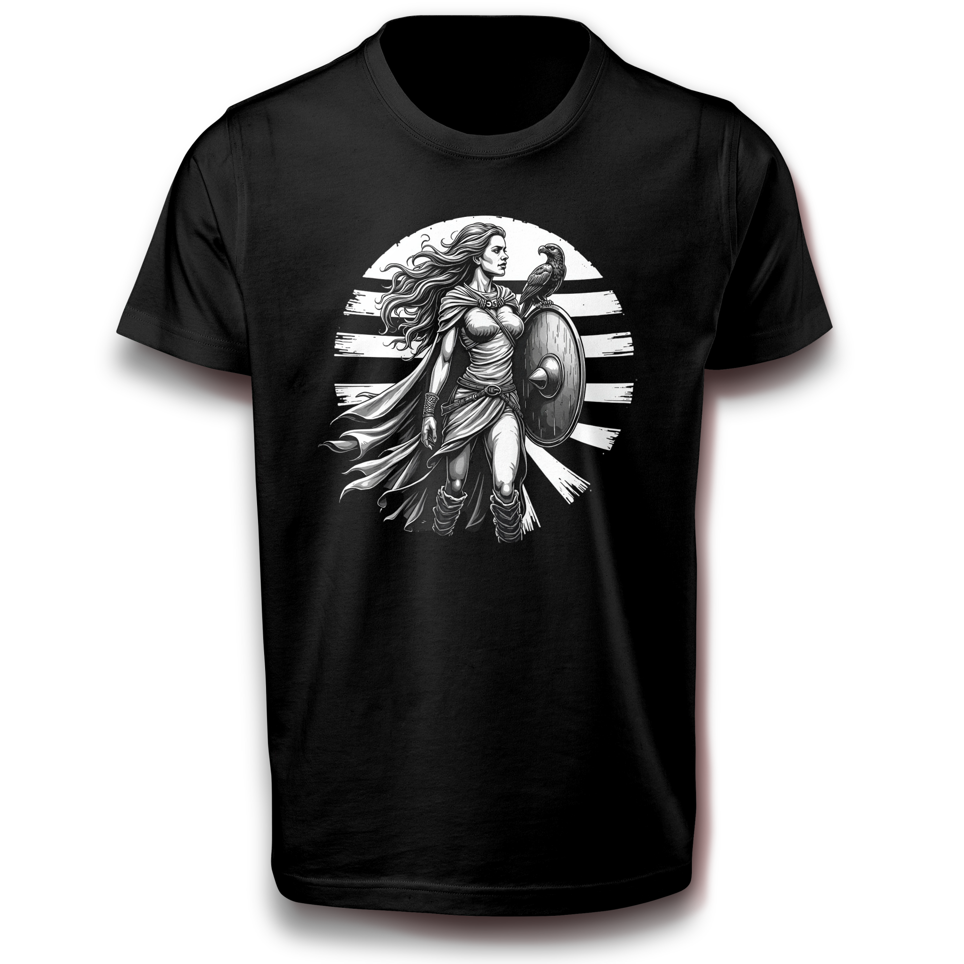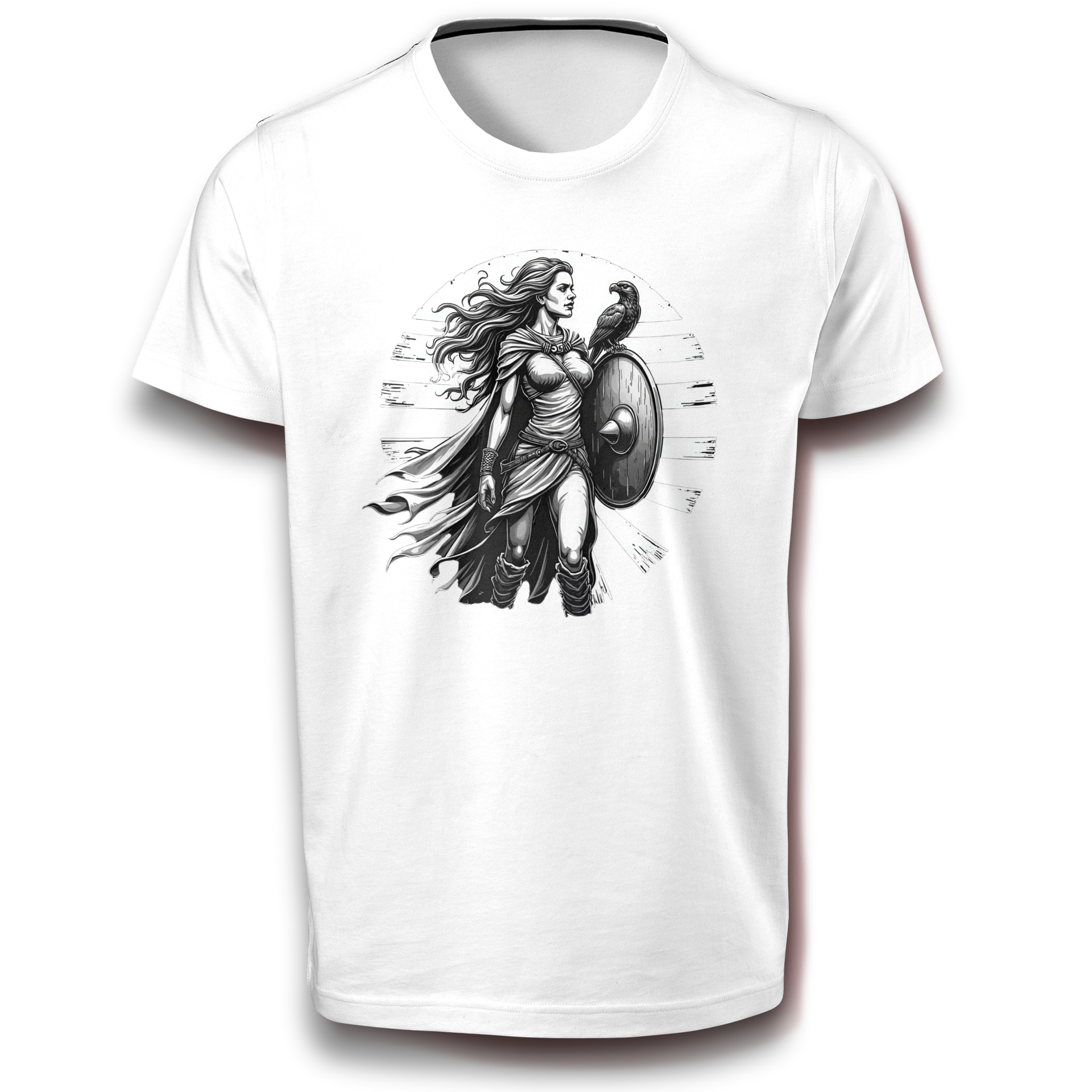 Erlebe die Kraft der alten Legenden! Unser Valkyrie Warrior T-Shirt zeigt eine furchtlose Wikinger-Kriegerin mit Schild und Rabe – inspiriert von der Mythologie der nordischen Völker. Die kunstvolle Illustration in Schwarz-Weiß bringt Dynamik und Stärke auf den Punkt. Perfekt für Wikinger-Enthusiasten, Fans nordischer Geschichte oder einfach als kraftvolles Fashion-Statement.