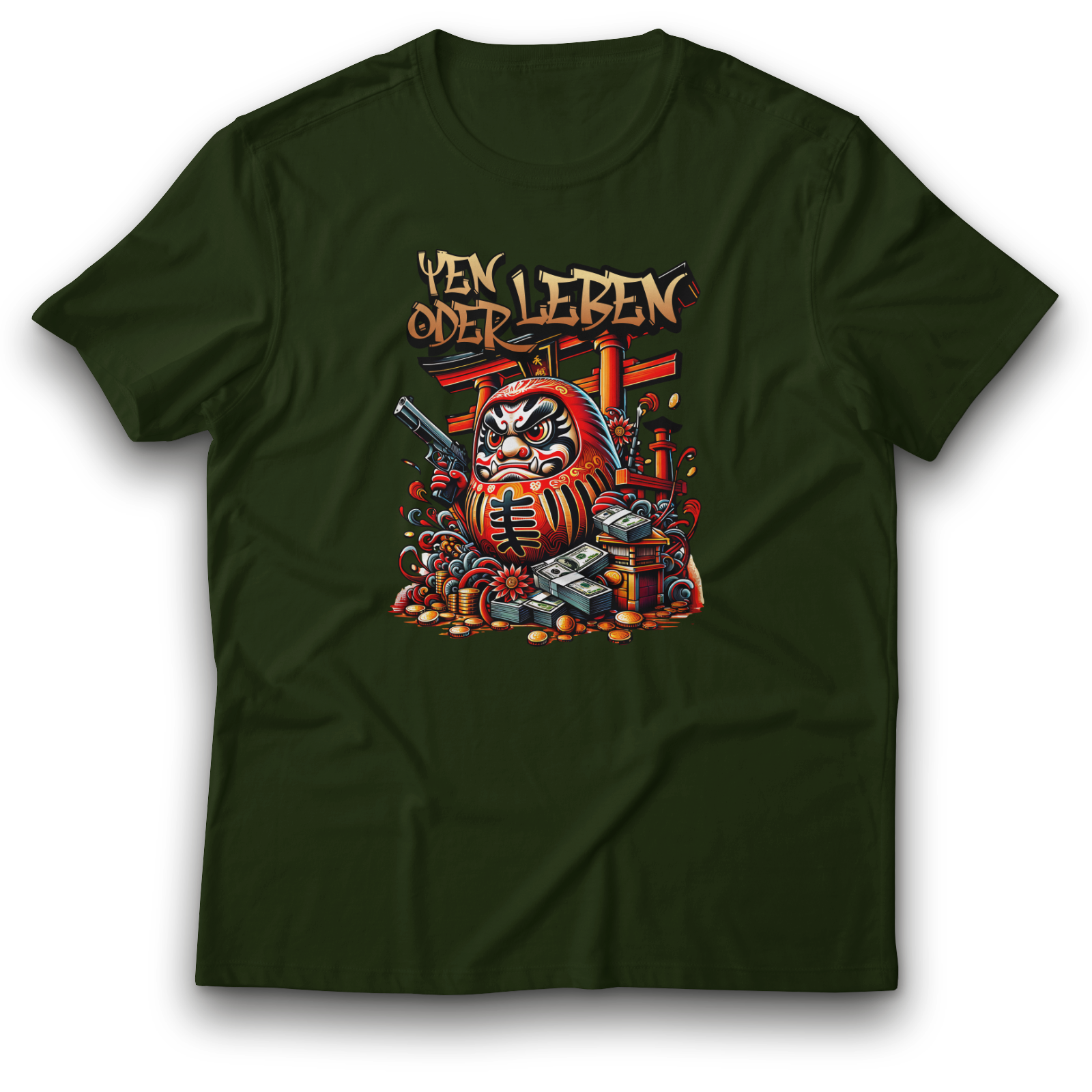 Dieses auffällige T-Shirt mit dem rebellischen Spruch „YEN ODER LEBEN“ bringt Streetwear-Ästhetik auf den Punkt: Im Zentrum steht eine wütende Daruma-Figur im japanischen Stil - bewaffnet, umgeben von Bargeld, Goldmünzen und einer explosiven Szenerie vor einem Torii. Das Motiv vereint fernöstliche Symbolik mit modernem Urban Flair und ist perfekt für alle, die ein Statement setzen wollen.