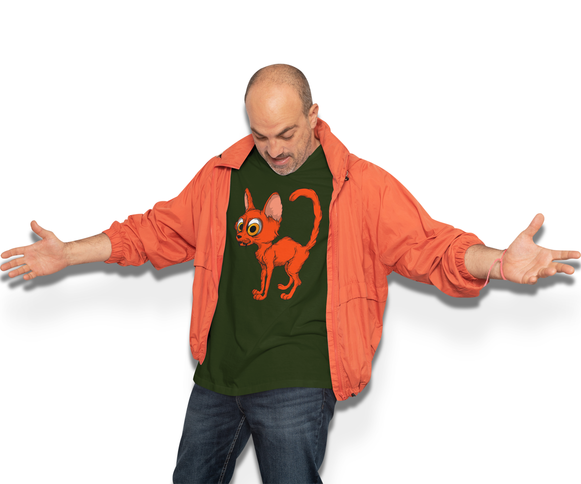 Diese schrille, orange Cartoon-Katze mit übergroßen Augen und frechem Blick sorgt für Aufmerksamkeit – ob in der Fußgängerzone, im Café oder beim nächsten Nerd-Event. Das Design verbindet schrägen Humor mit einem einzigartigen Illustrationsstil im Comic-Look. Perfekt für Katzenliebhaber, Freaks und alle mit einem Sinn für das Schräge im Leben.