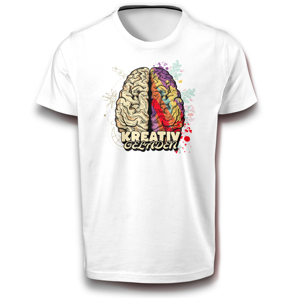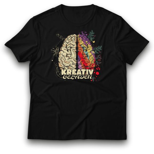 Entfalte deinen Geist – mit diesem „KREATIV GELADEN“-Shirt! Das ausdrucksstarke Design zeigt ein zweigeteiltes Gehirn: die linke Hälfte mechanisch und logisch, die rechte Hälfte farbenfroh und künstlerisch - ein Symbol für Balance aus Ratio und Kreativität. Perfekt für Designer, Freigeister, Künstler, Wissenschaftler oder alle, die denken und fühlen zugleich.
