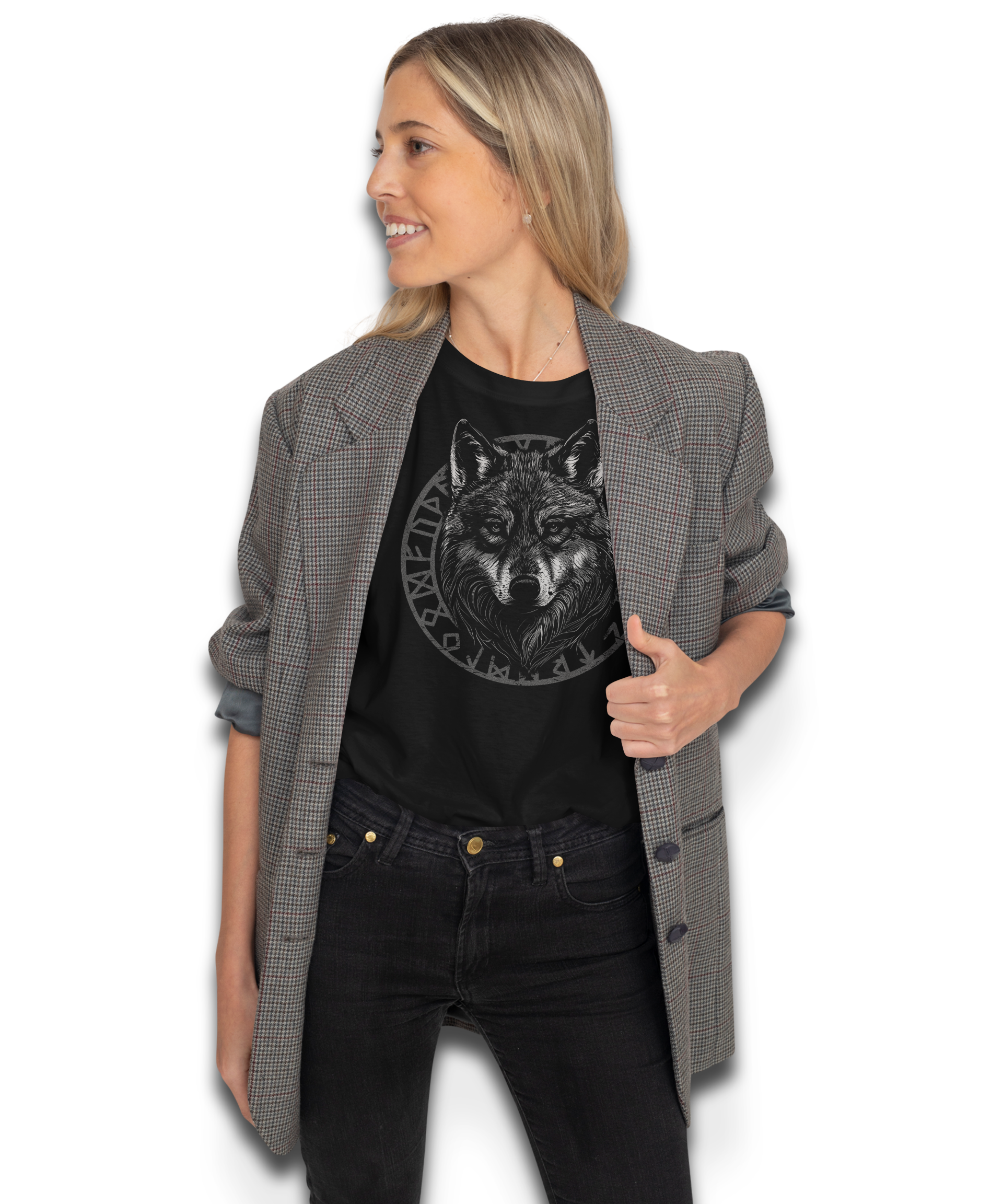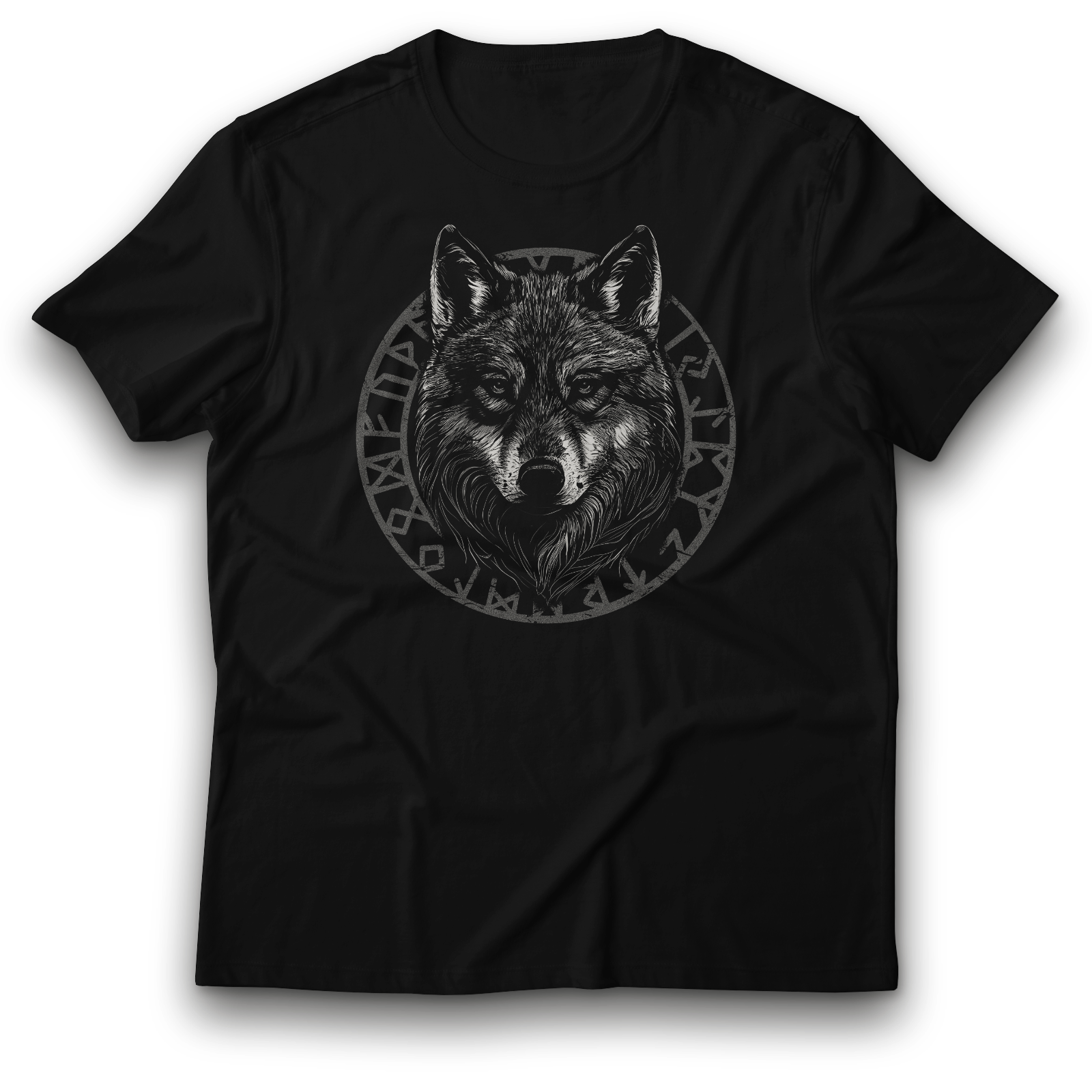 Mit diesem nordischen Wolf im Runenkreis zeigst du Haltung, Kraft & Tiefe.