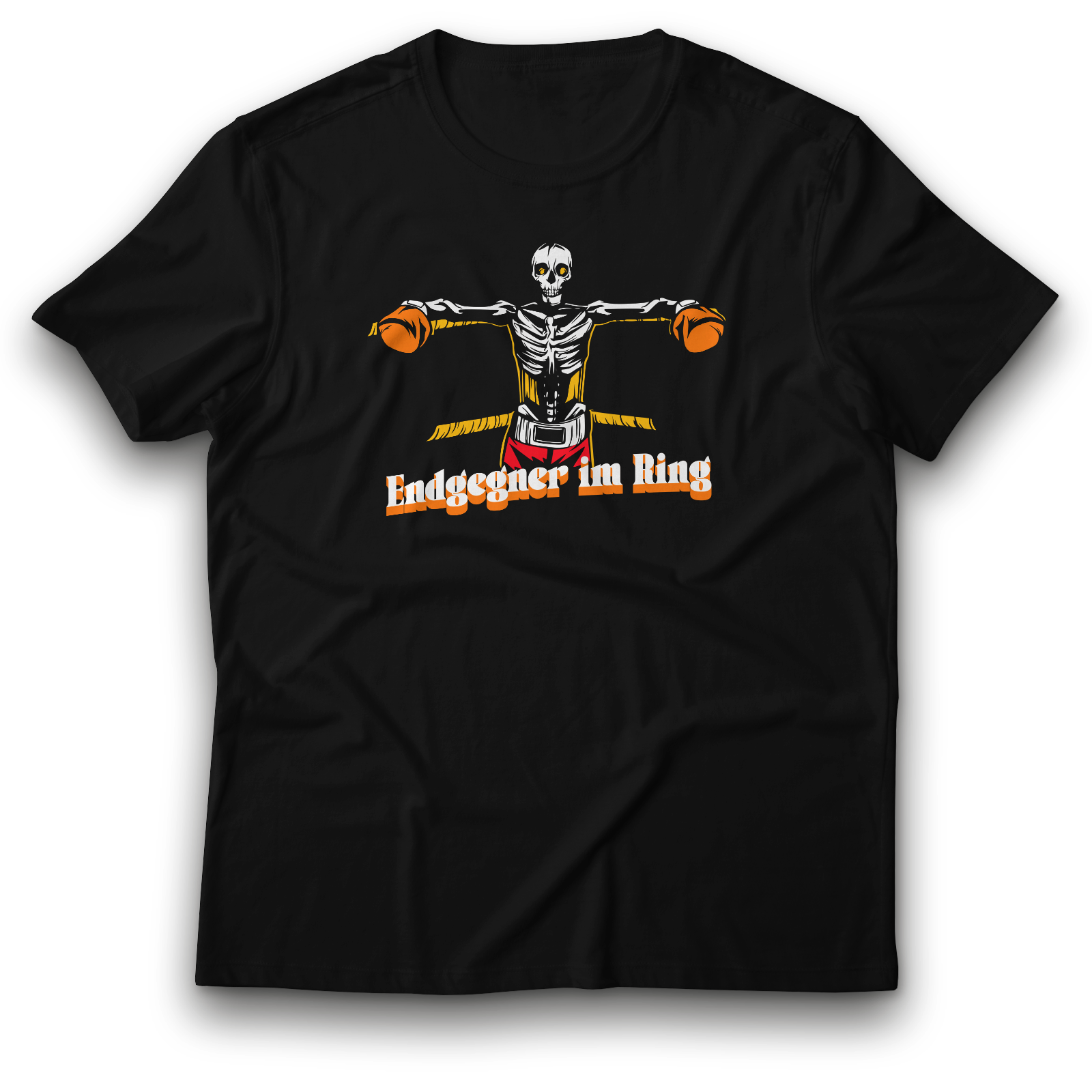 Mit dem „Endgegner im Ring“-T-Shirt bekommst du genau das: ein auffälliges Skelett-Boxer-Motiv mit düsterem Charme und Retro-Flair.