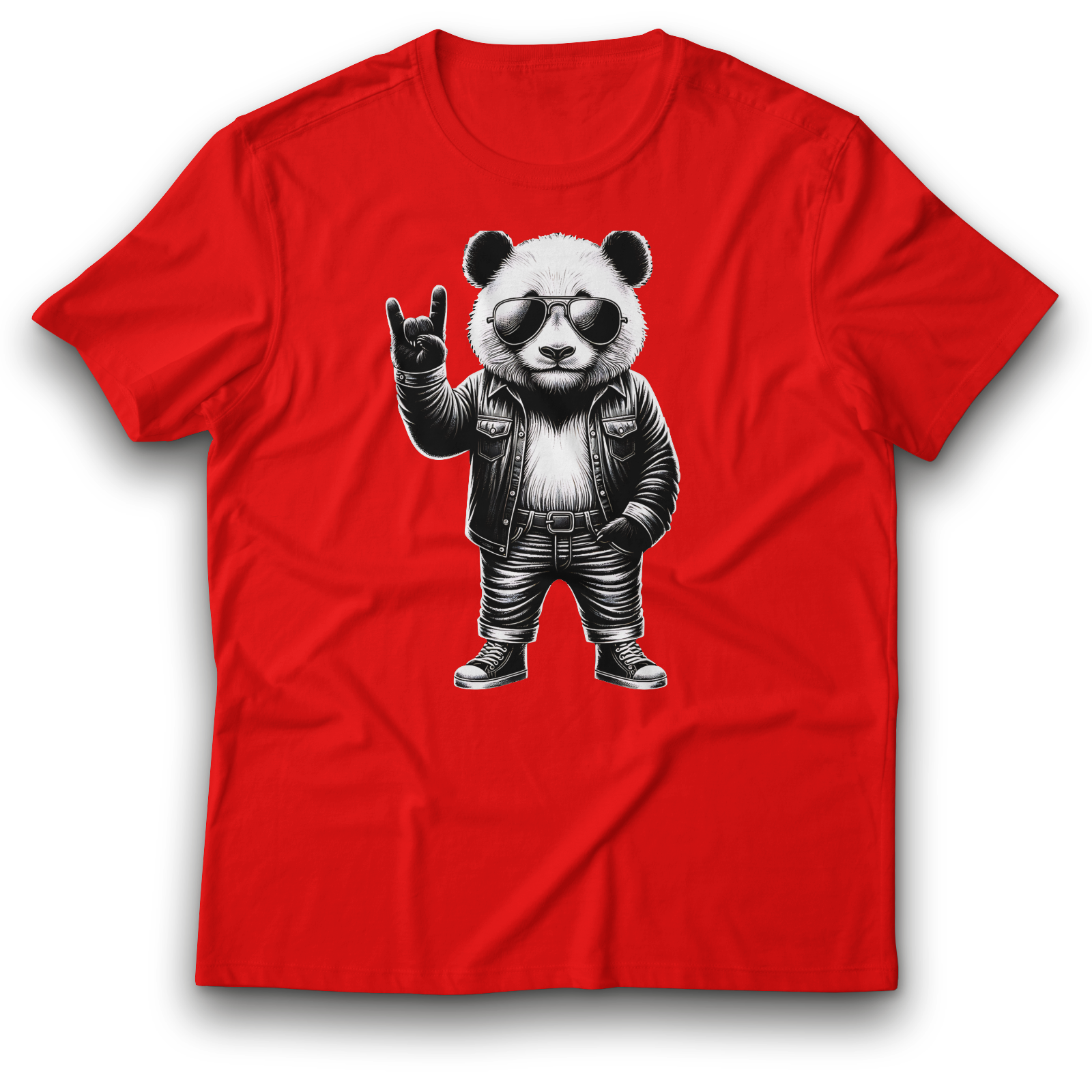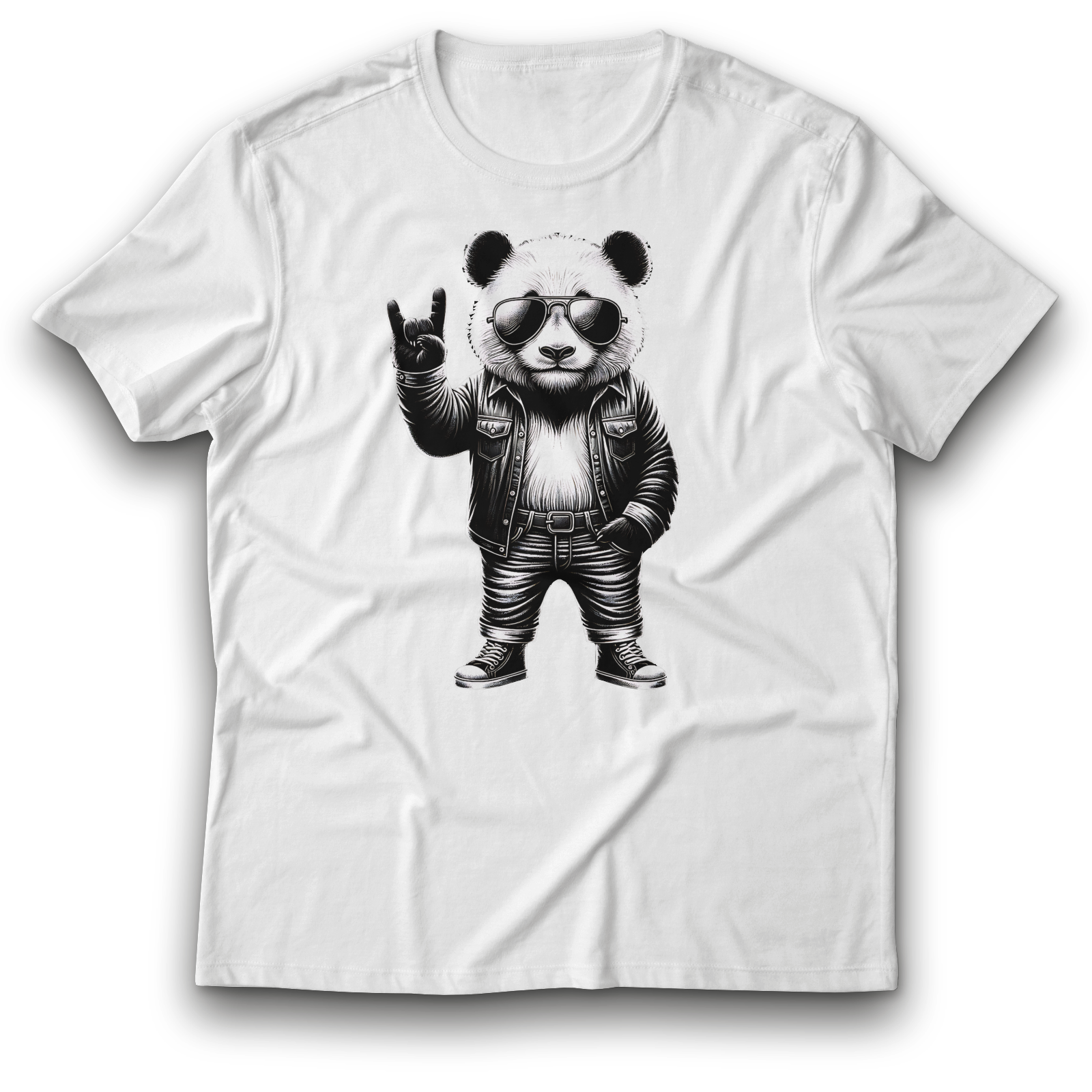 Der coolste Panda aller Zeiten! Dieses Shirt zeigt ein kraftvolles Schwarzweiß-Motiv: ein Panda im Rock-Outfit mit lässiger Lederjacke, Rock’n’Roll-Hand und cooler Sonnenbrille. Stilvoll, rebellisch - einfach stark.