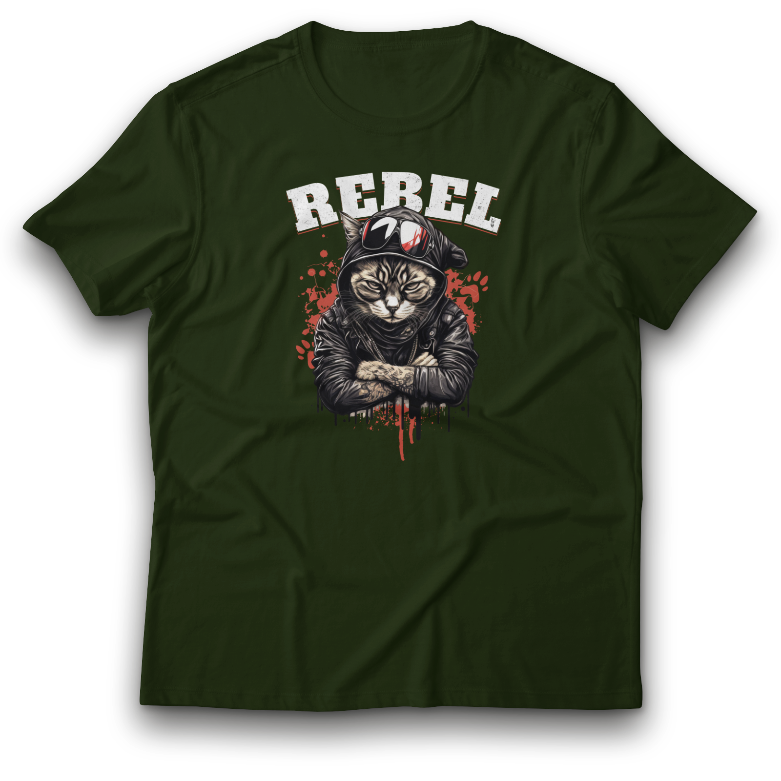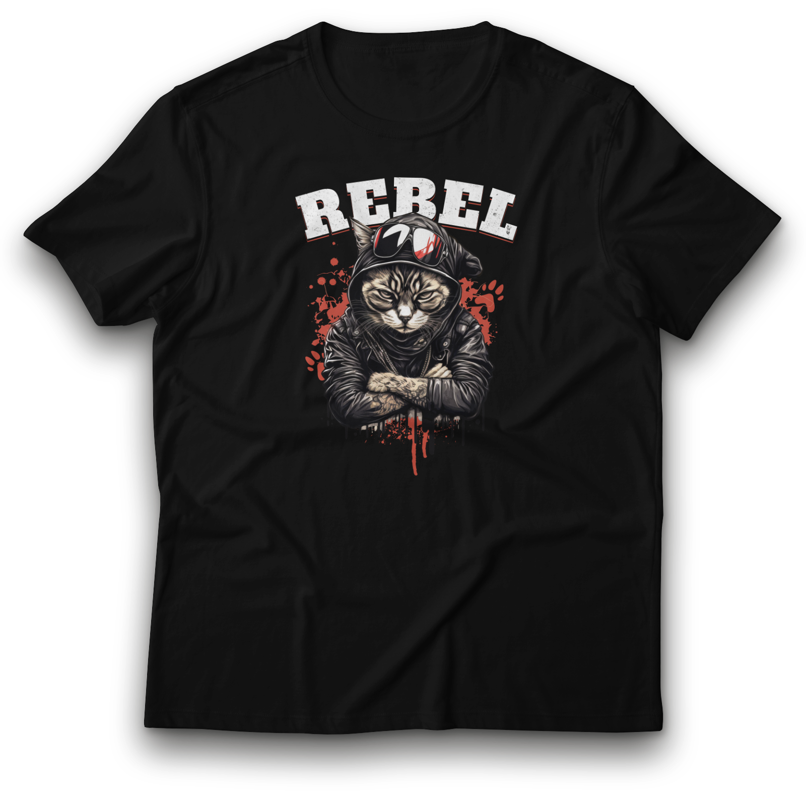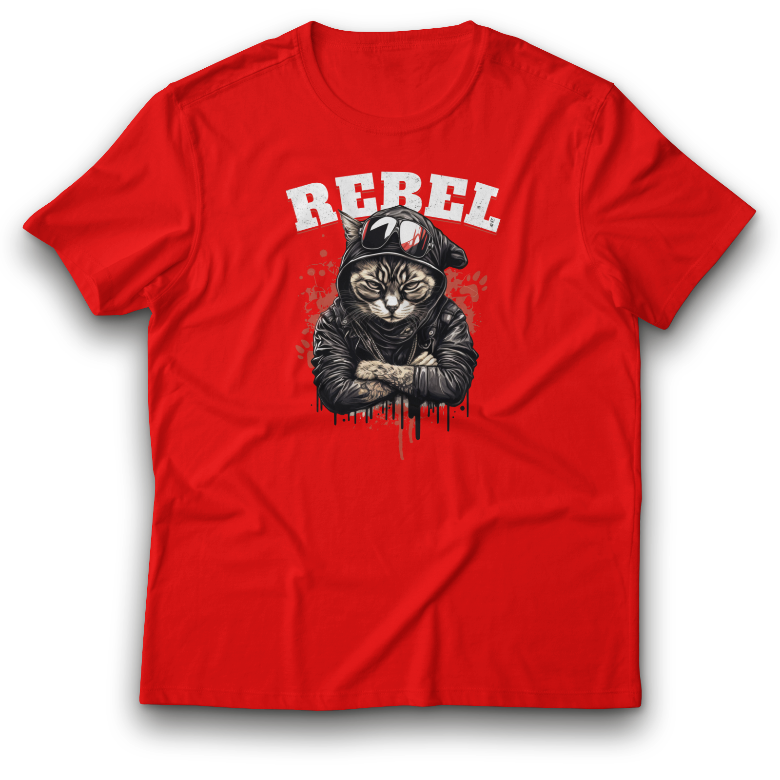 Setze ein Statement mit unserem Rebellischen Katzen T-Shirt, das eine coole Katze in einer Lederjacke und Pilotenbrille zeigt. Umrahmt von markanten roten Spritzern und dem Schriftzug „REBEL“, spiegelt dieses Design eine freigeistige, selbstbewusste Haltung wider. Ideal für Katzenliebhaber und alle, die einen rebellischen Look suchen.