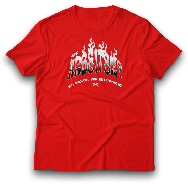 Dieses lässige T-Shirt mit dem humorvollen Spruch „ARBEITEN? ICH DACHTE, WIR ENTSPANNEN!“ kombiniert Stil und Humor. Die verspielte Schriftart und die dynamische Flammen-Grafik machen das Shirt zu einem echten Hingucker. Erhältlich in vier unterschiedlichen Farben – Schwarz, Rot, Blau und Grün - bietet es vielseitige Kombinationsmöglichkeiten für jedes Outfit.
