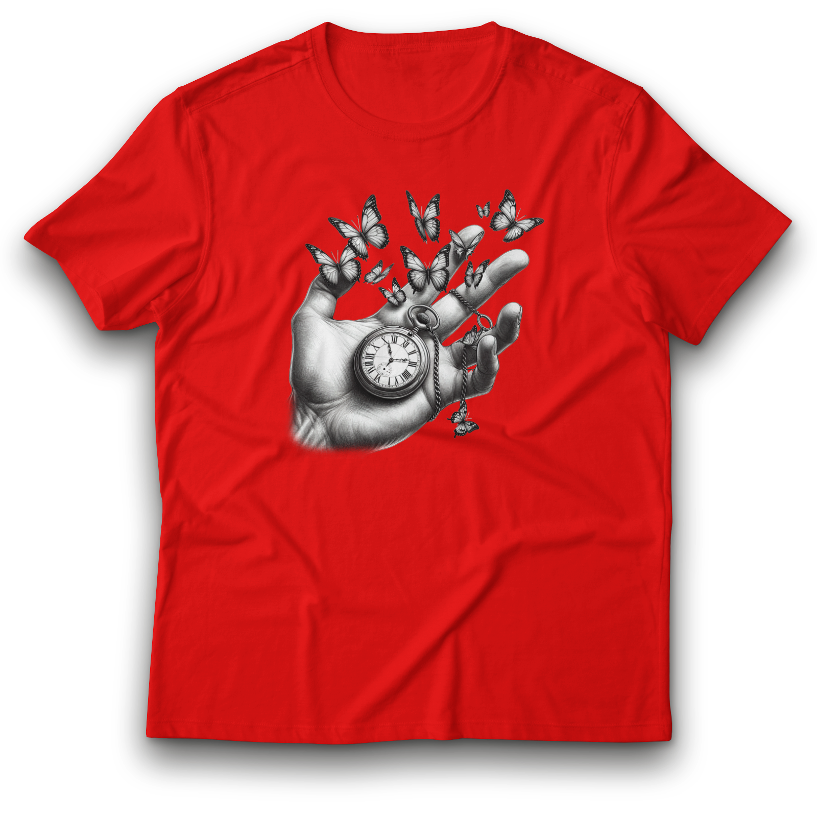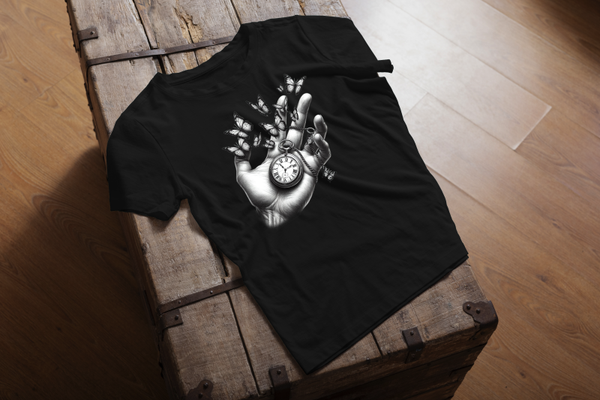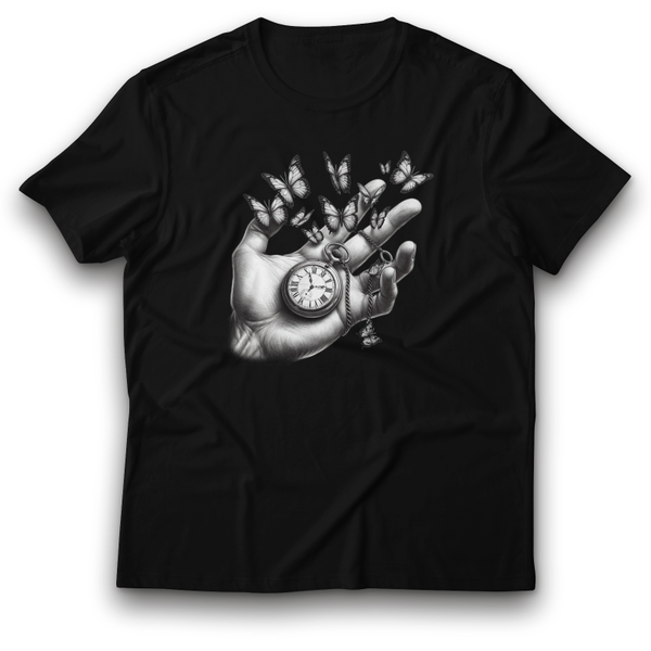 Entdecken Sie unser außergewöhnliches T-Shirt mit kunstvollem Schmetterling-Taschenuhr-Design! Dieses einzigartige Motiv verbindet zeitlose Eleganz mit symbolischer Tiefe.