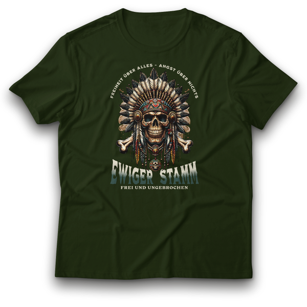 Die „Ewiger Stamm“-T-Shirts fangen das unerschütterliche Gefühl von Freiheit, Stolz und Stärke ein. Mit einem markanten Design, das einen Totenkopf mit Indianer-Kopfschmuck und den Schriftzug „Ewiger Stamm - Frei und Ungebrochen“ kombiniert, ist dieses T-Shirt ein starkes Symbol für Widerstandskraft und Mut. Der Slogan „Freiheit über alles - Angst über nichts“ unterstreicht das Thema der Freiheit und des unabhängigen Geistes. Erhältlich in den kraftvollen Farben Schwarz, Rot, Blau und Grün – das perfekte Statement für die, die sich von nichts und niemandem einschränken lassen.