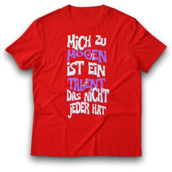 Zeig deinen Humor mit diesem einzigartigen T-Shirt! Der freche Spruch "Mich zu mögen ist ein Talent das nicht jeder hat" sorgt garantiert für Lacher und macht dich zum Hingucker. Verfügbar in verschiedenen Farben (Schwarz, Rot, Blau, Grün) mit stylischer Typografie in Weiß und Lila.