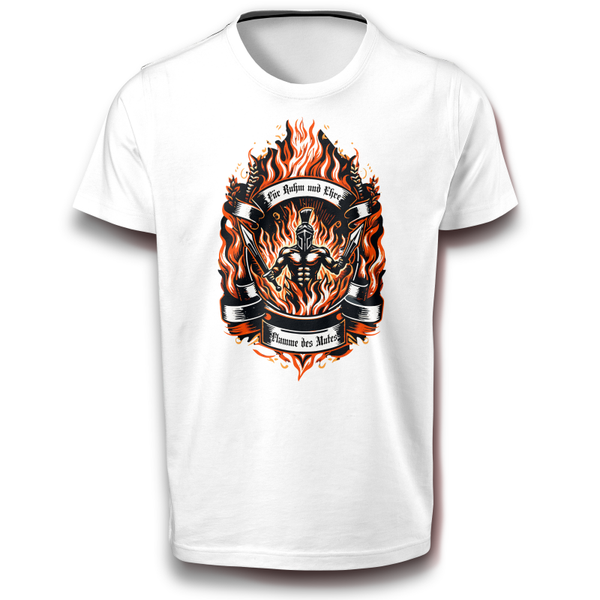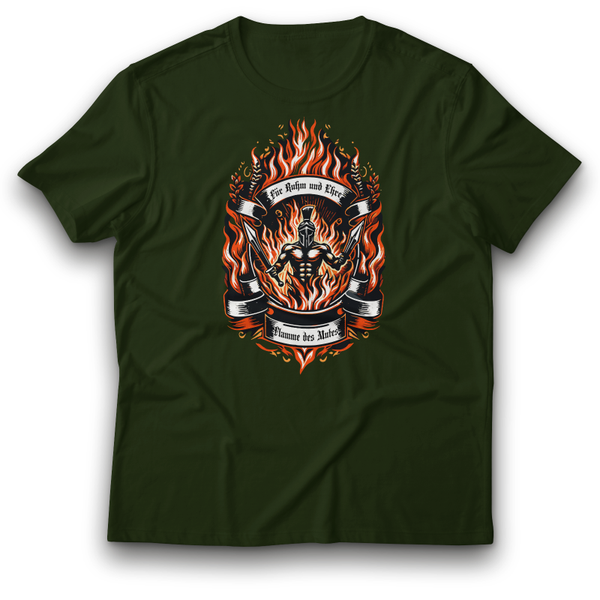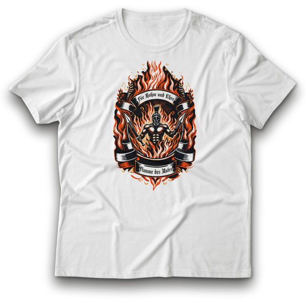 Tauche ein in die Welt der Krieger und tapferen Helden mit unserem exklusiven „Für Ruhm und Ehre - Flamme des Kriegers“ T-Shirt. Dieses T-Shirt verkörpert das unerschütterliche Streben nach Ehre und Mut, umgeben von flammendem Feuer, das den Krieger in dir entfacht. Das kräftige Design, das eine antike Kriegerfigur inmitten lodernder Flammen darstellt, ist ein starkes Symbol für Stärke, Entschlossenheit und die Flamme des Kriegers.