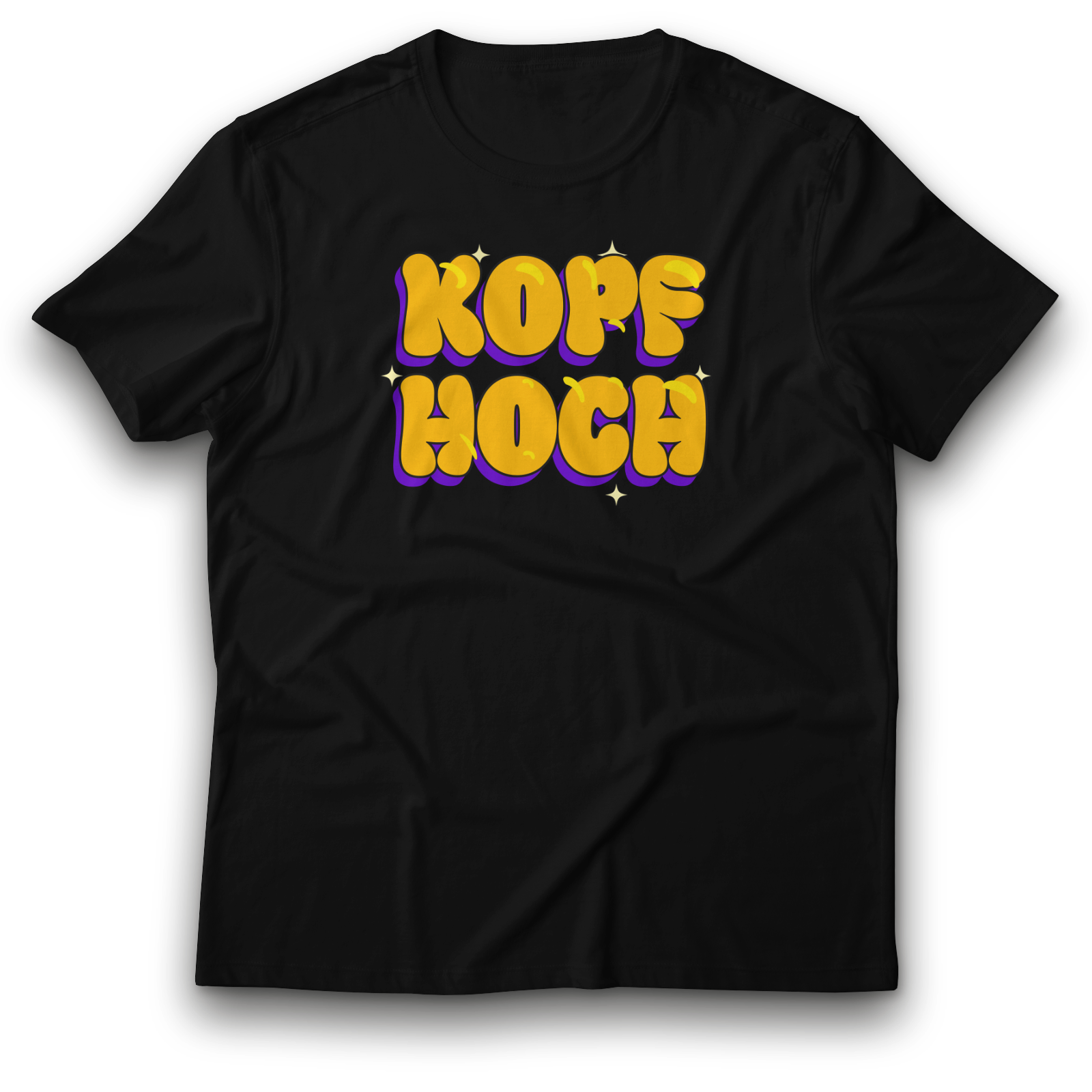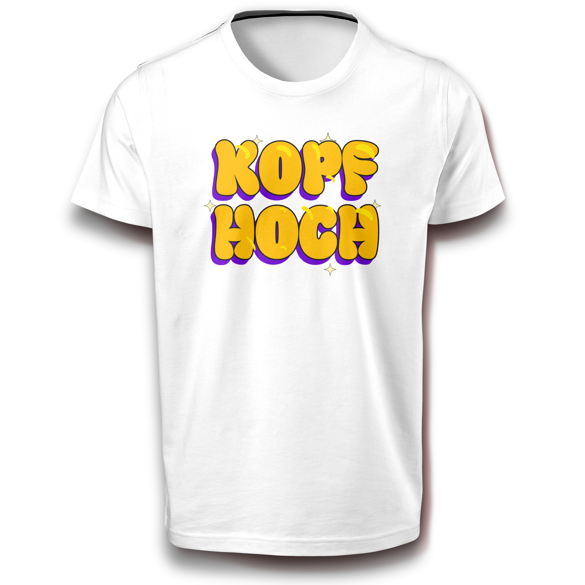 Hebe dein Selbstbewusstsein mit diesem einzigartigen „Kopf Hoch“-T-Shirt! Der bunte, retro-inspirierte Schriftzug bringt nicht nur gute Laune, sondern auch eine klare Botschaft: Bleib positiv und stark, egal was kommt! Mit seiner auffälligen Farbgestaltung in Gelb, Lila und Blau sorgt das Design für einen frischen, lebendigen Look, der alle Blicke auf sich zieht. Perfekt für alle, die eine positive Einstellung zeigen wollen - ob im Alltag oder bei besonderen Anlässen.