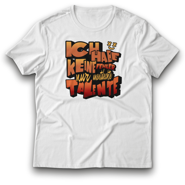 Das „ICH HABE KEINE FEHLER, NUR UNENTDECKTE TALENTE“ T-Shirt ist der perfekte Begleiter für alle, die ihren Humor und ihr Selbstbewusstsein in einem modernen, auffälligen Design zeigen möchten. Die kräftige Schrift kombiniert mit der warmen Farbauswahl macht dieses T-Shirt zu einem echten Blickfang. Ob für den Alltag oder besondere Anlässe – mit diesem Shirt trägst du nicht nur ein cooles Design, sondern setzt auch ein humorvolles Statement.