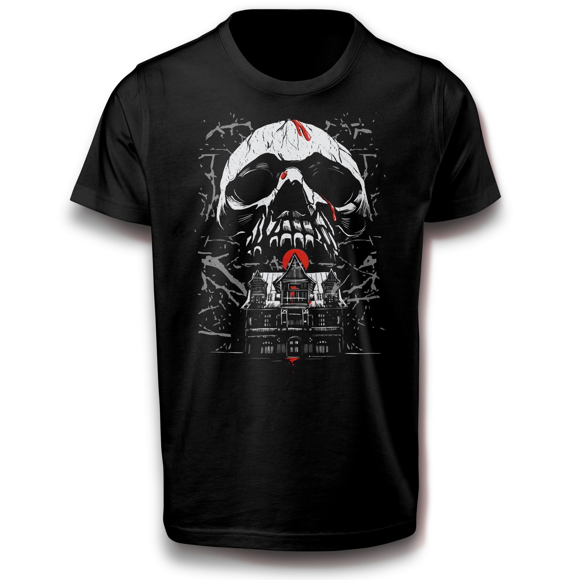 Totenkopf und Spukhaus über Gebäude T-Shirt Design 152-3XL Baumwolle Blut, Drama, Halloween, Horror, Knochen, Schädel, Skelett